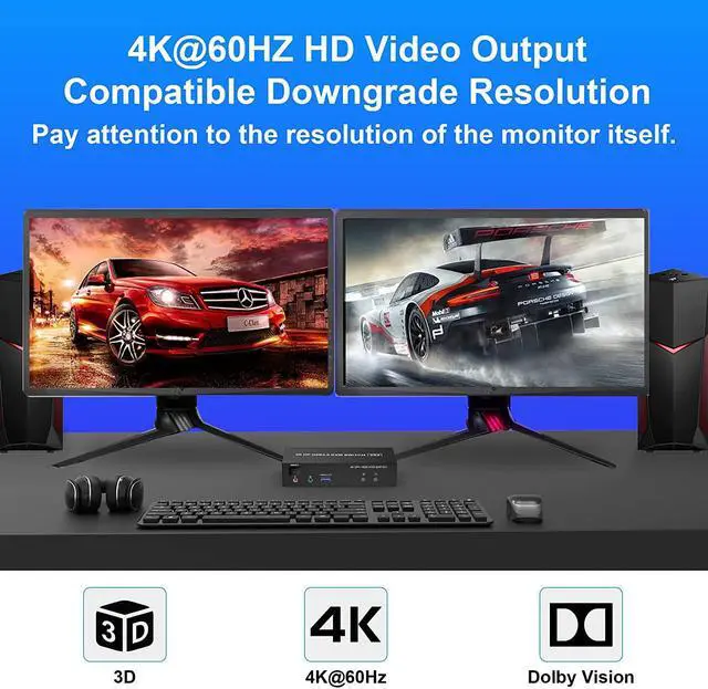 Displayport KVM Switch up to 4K@60HZ: This small & exquisite kit supporting high resolution max up to 4K@60Hz, and also supports 3D and 1080P@60Hz or other lower resolution (Downward Compatible). Complies with the DP 1.2 standard.