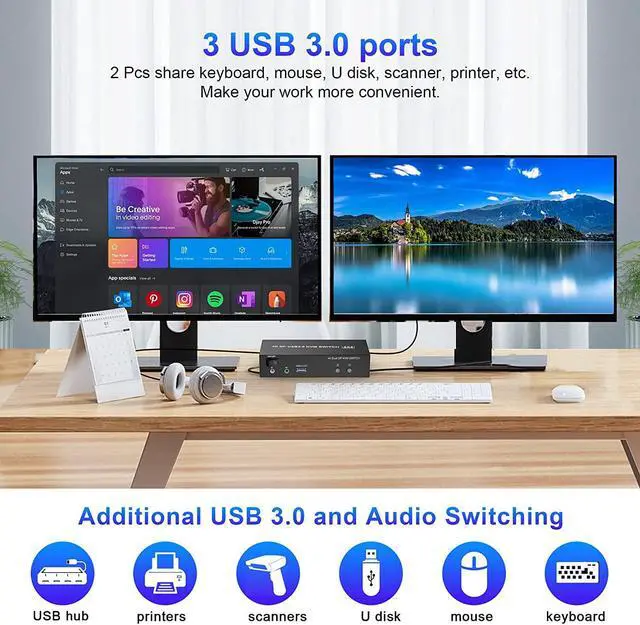 With 3 USB 3.0 Ports: Dual monitor DP USB switch with extra USB 3.0 port for sharing USB printers, scanners and jump drives, wireless and gaming keyboard mouse. supports ultra-fast USB 3.0 data transfer up to 5Gbps. The upgraded design hides the messy cables at the back, leaving a USB 3.0 port on the front for inserting a USB flash drive. Unique design makes the desktop more tidy, Say goodbye to cluttered cables. Also supports separate audio and microphone output.