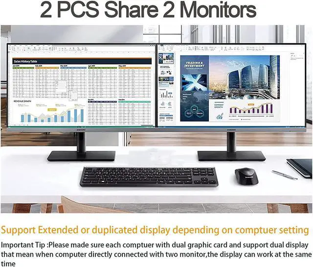 Dual Monitor Kvm Switch HDMI The 2 computer 2 monitor kvm switch allow you to control 2 PCs by only one set of keyboard & mouse, share 4 USB devices and 2 monitors (Extend display mode or copy display mode). Please note that the extended mode can output two different screens, and the copy mode can output two identical screens.