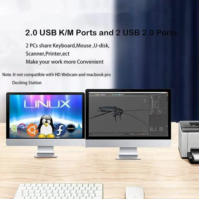 PC Monitor KVM Switch with 4 USB 2.0 Ports SelectorThe KVM Switch Dual Monitor HDMI with 4 standard USB 2.0 port which can recognize wired/wireless keyboard mouse USB hard drive printer or other USB devices. Please note that this 2 Port KVM switch not compatible with HD Webcam and macbook pro, so we don' t recomand connect to our product.