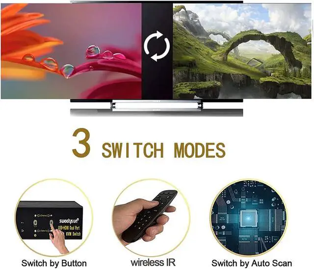 Dual Monitor HDMI Switch with 2 Switching Mode Supports multiple switching modes to jump between personal and work around 0.3 seconds via push button, also support auto scan, Wireless remote Switching. LED indicate the active computer. noted: Dual-Screen requires 2 HDMI connection from each computer to the KVM switch, please be aware of the adapters you might need before order