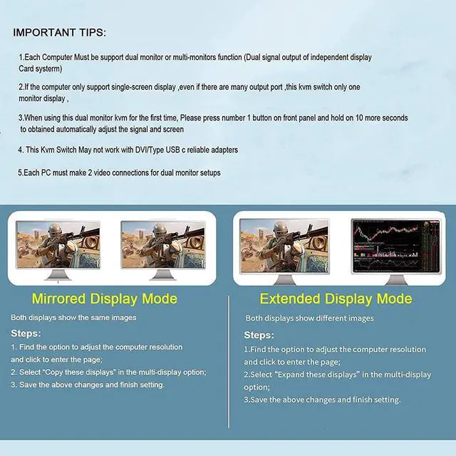 Note 1The 2 Port dual-monitor KVM switch requires each computer to have Dual output ports and supports dual screen extended display, Not Support DVI to HDMI converter, compatible with DP to HDMI converter/VGA to HDMI converter. If your computer only supports single display, then this product cannot help you get dual display function.