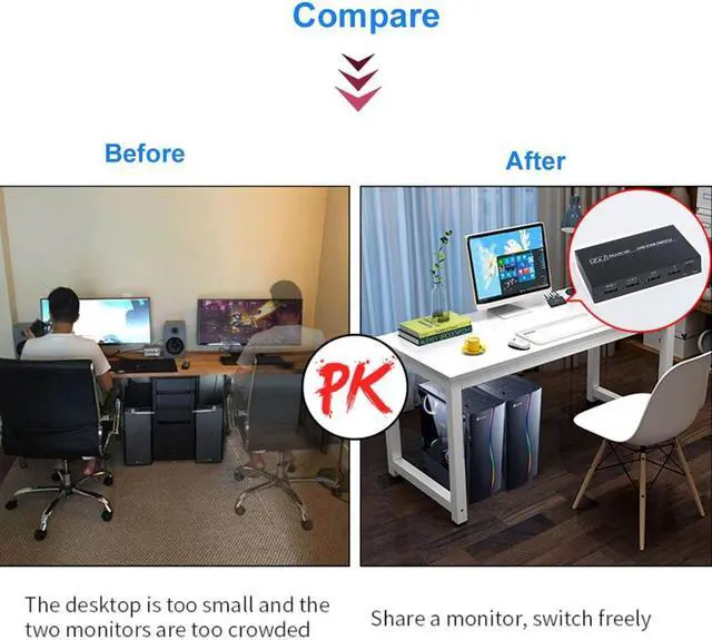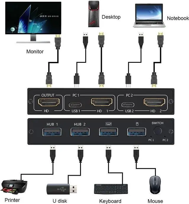 (2) the two devices share a printer, U disk, hard disk and other devices. The product supports 4K60Hz high-definition output, and has a wide range of application scenarios (such as office switching, video conferencing, multi teaching, securities finance, etc. ), which can save office costs, convenient operation, plug and play.