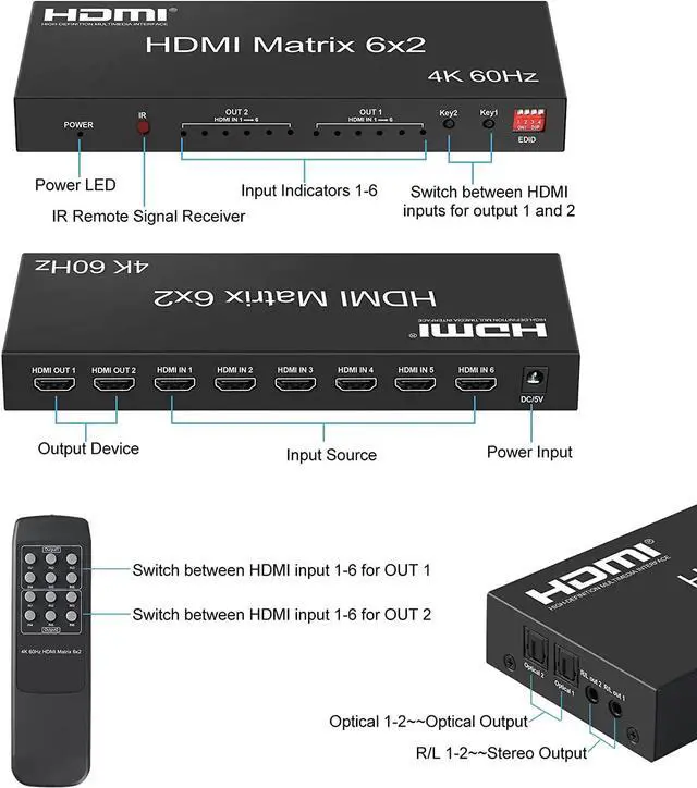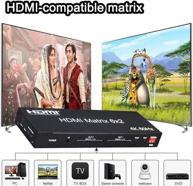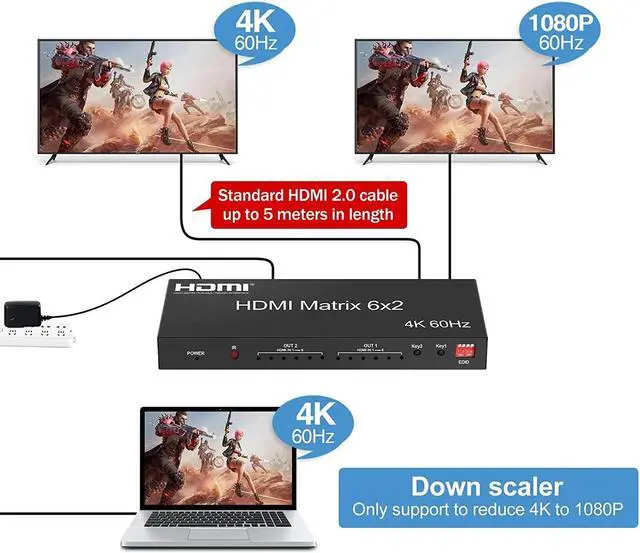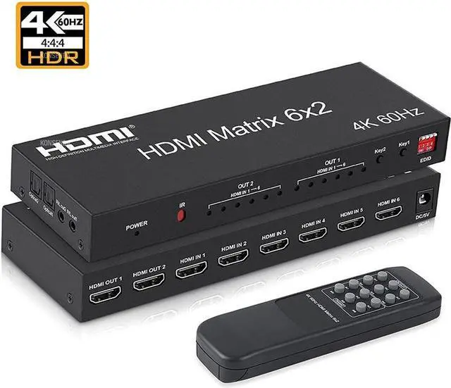 4K 60Hz HDMI Matrix 6x2 Matrix HDMI 2.0 Video Switcher Splitter 6 in 2oOut with Optical 3.5mm Audio out for Laptop PC TV Monitor(UK Plug)