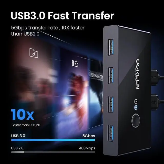 USB 3.0 Switch supports ultra-fast USB 3.0 data transfer rates of up to 5Gb/s (10 times faster than USB 2.0 )