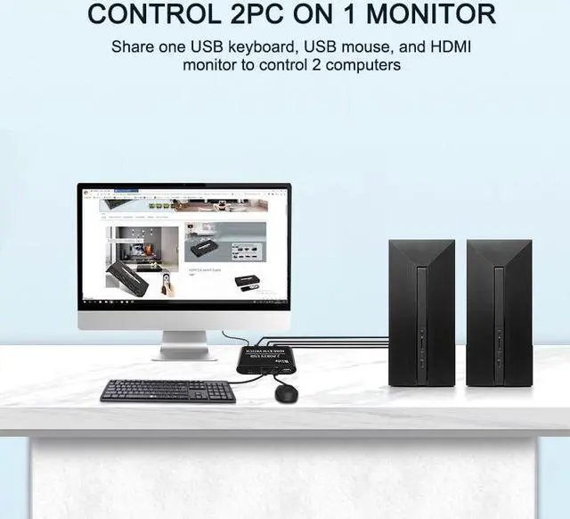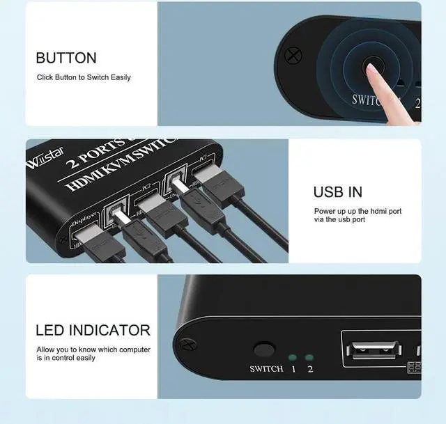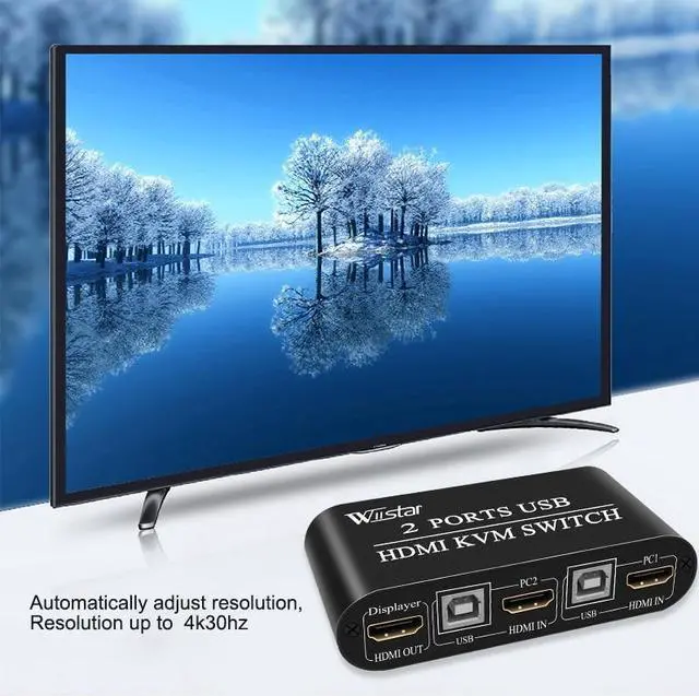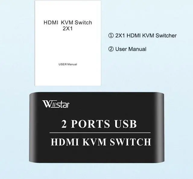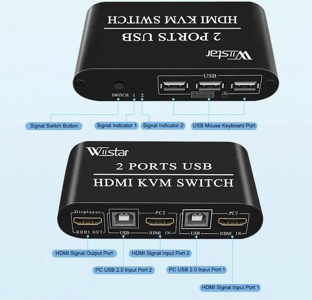 Wiistar HDMI KVM Switch allows you to share one USB keyboard, USB mouse, and monitor to control 2 computers. It is designed for multitask with two computers at your convenience, increasing productivity in the office or at home; You can switch between 2 computers using a manual switch located on the top of the KVM unit