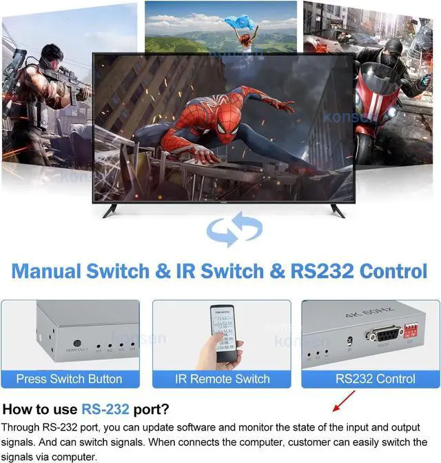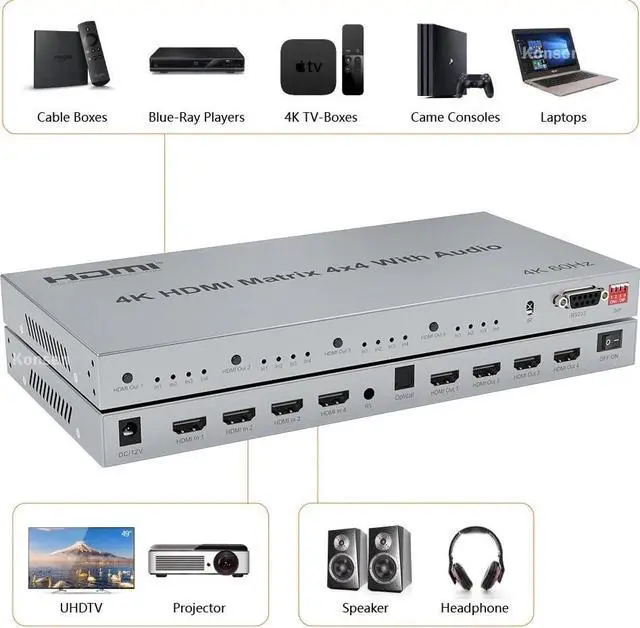 • 4K@60Hz HDMI Matrix Switch 4x4 with Audio Extractor 4 in 4 Out HDMI 2.0 Matrix Switcher Splitter Selector box HDR HDCP2.2 18Gbps(With UK Plug)