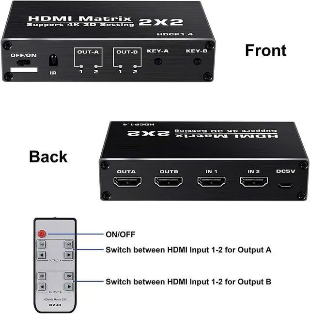 • 2x2 HDMI Matrix Switcher 4K 3D Matrix HDMI Switch Splitter 2 in 2 out Video Audio Converter with IR Control for PS4 PC Laptop TV(With US Plug)