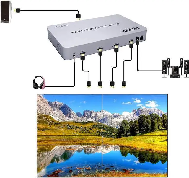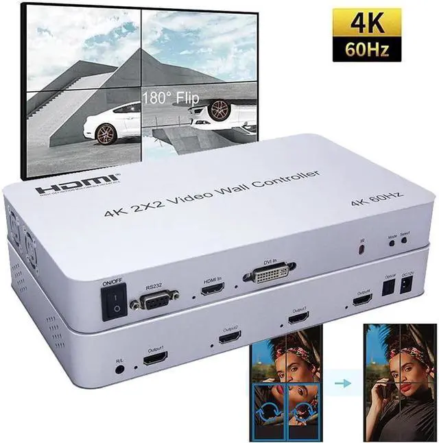 4K 60Hz Vertical Video Wall Controller 2x2 1X2 1X3 1x4 90° 180 Degree Rotate Large Screen Display TV Wall Splicer Processor Box(With US Plug) (4K 60Hz 2x2)