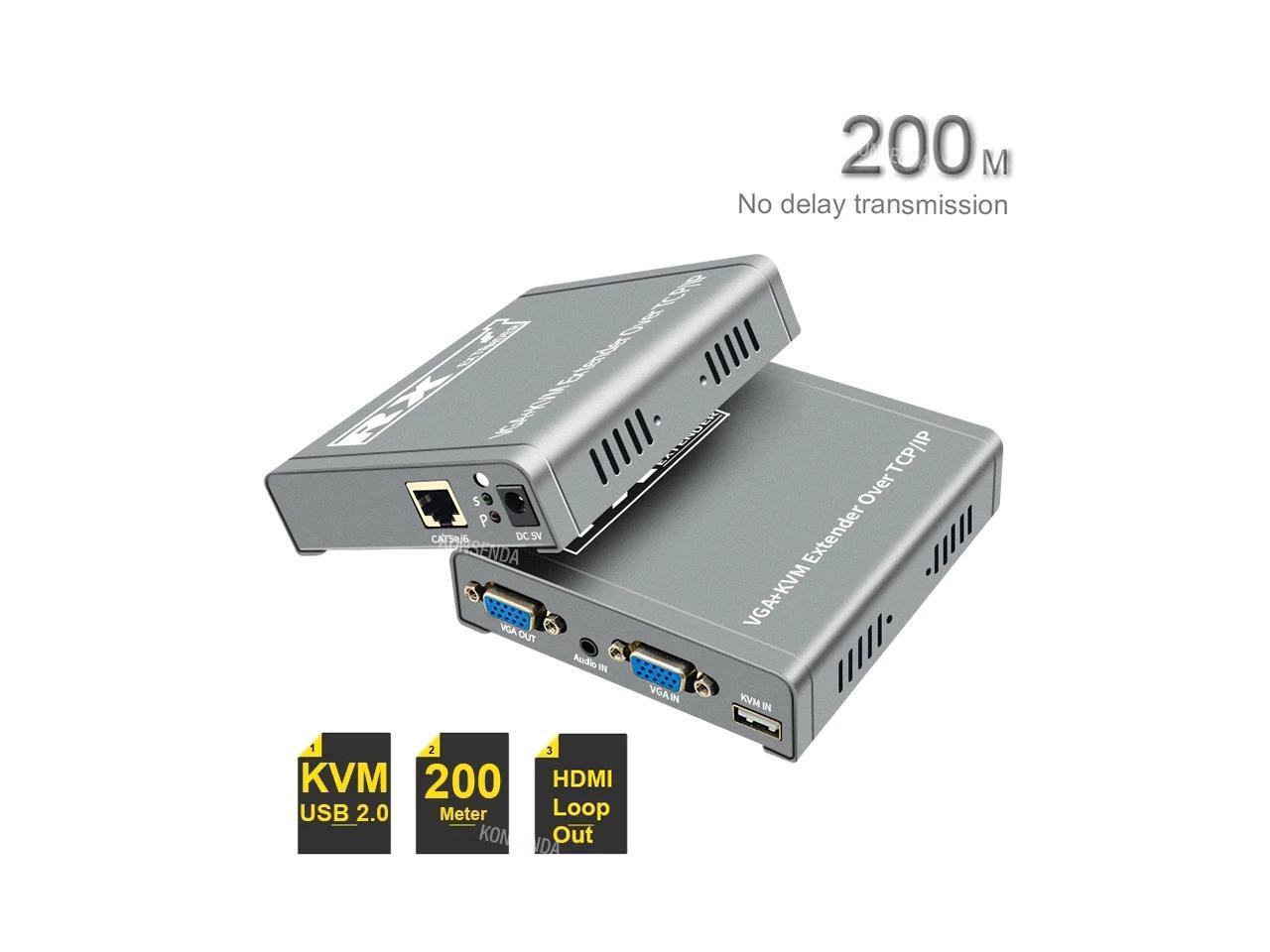 (With US Plug)(only one RX)200M VGA KVM Extender over IP UTP/STP RJ45 Ethernet Cat5e/6 Cable 1080P VGA USB Extension Transmit Switch Support Keyboard Mouse