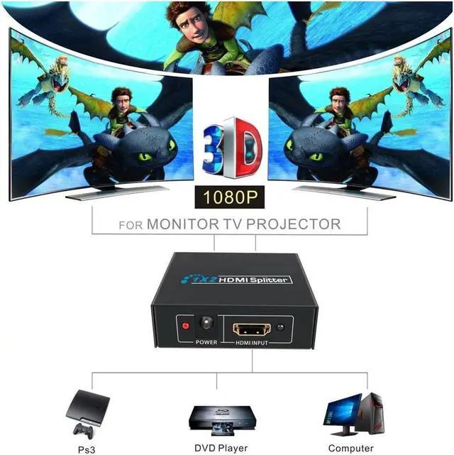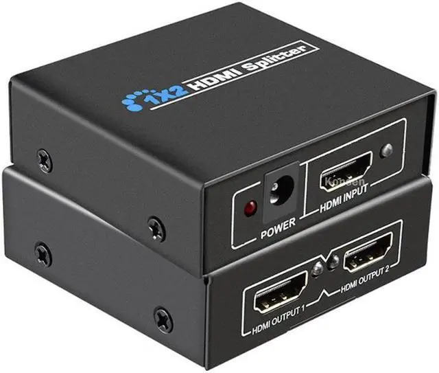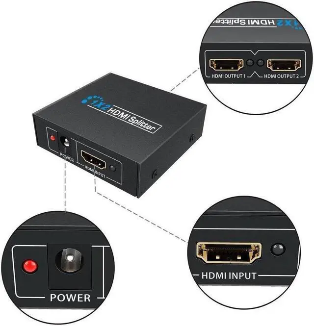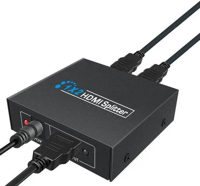 1x2 HDMI splitter distributes 1 HDMI source to 2 HDMI displays simultaneously.