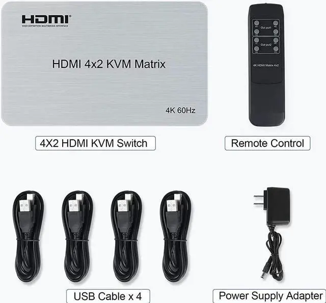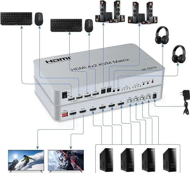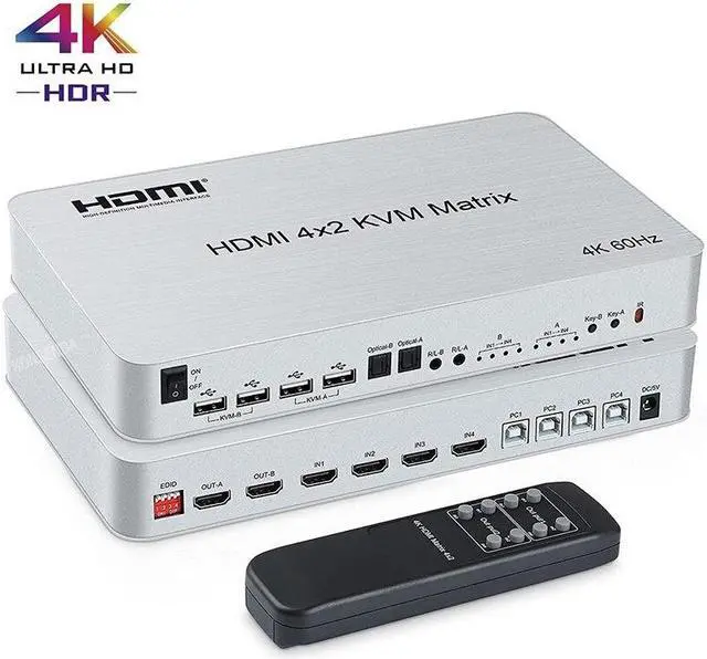 • 4 Port USB HDMI KVM Matrix 4x2 Dual Monitor 4K 60Hz HDMI Matrix Switch Splitter Audio Video Converter Support USB Keyboard Mouse(UK Plug)