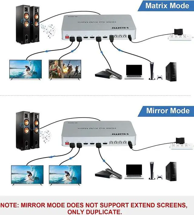 1. This HDMI 4X2 KVM matrix, it can switch between 4 input signal source devices, and distribute the signal to 2 monitors (2 monitors can display the same picture or different pictures) and any one output All ports can realize independent audio output through Optical SPDIF or 3.5 mm audio jack.