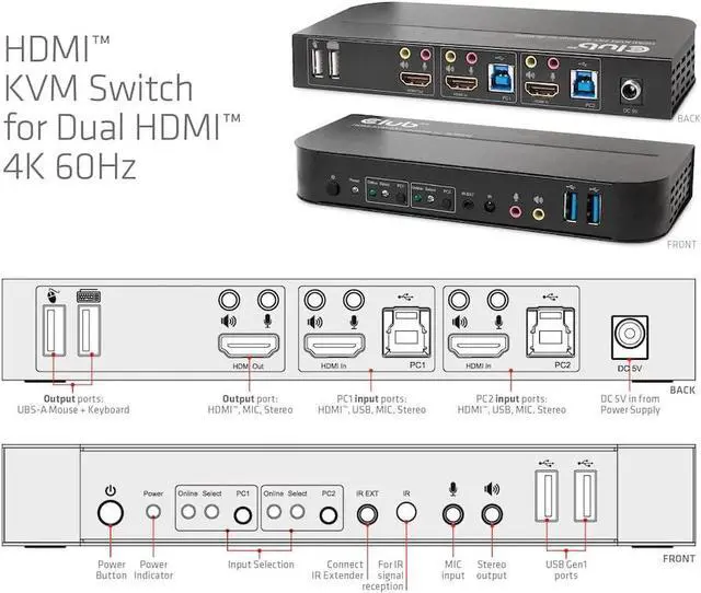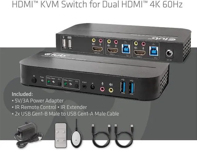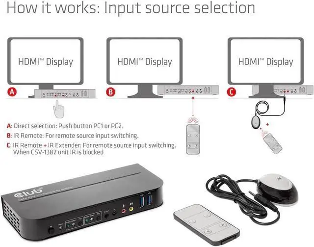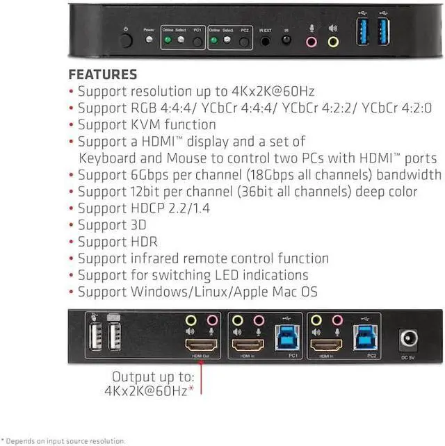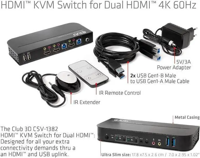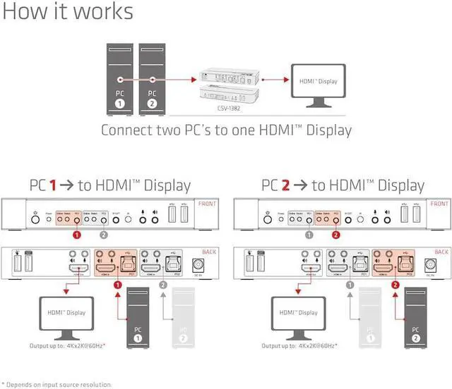 The CSV-1382 is a high-performance HDMI KVM switch (Keyboard Video and Mouse). It forwards high-resolution video up to 4096 x 2160 at a resolution of 60Hz and audio from any HDMI source to any HDMI-supported display. This HDMI KVM switch not only has the keypress switch function, but also has an intelligent function as well as a hot plug function.