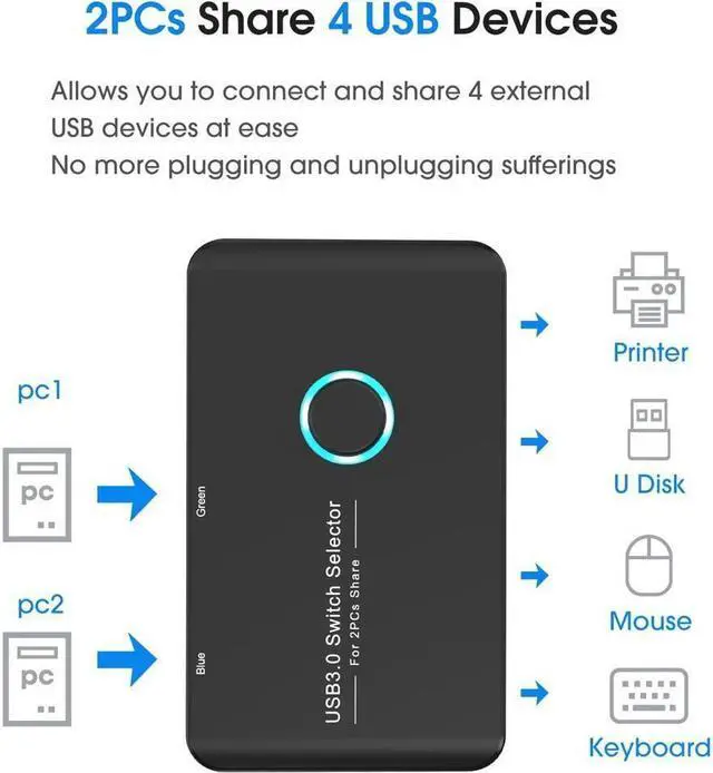 An excellent choice to expand the personal computer/laptop s USB 3.0 port into 4, allowing 2 computers to share 4 USB devices.