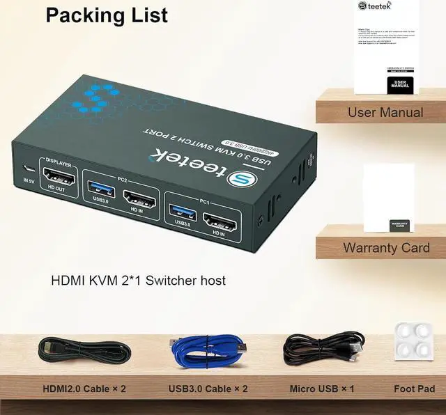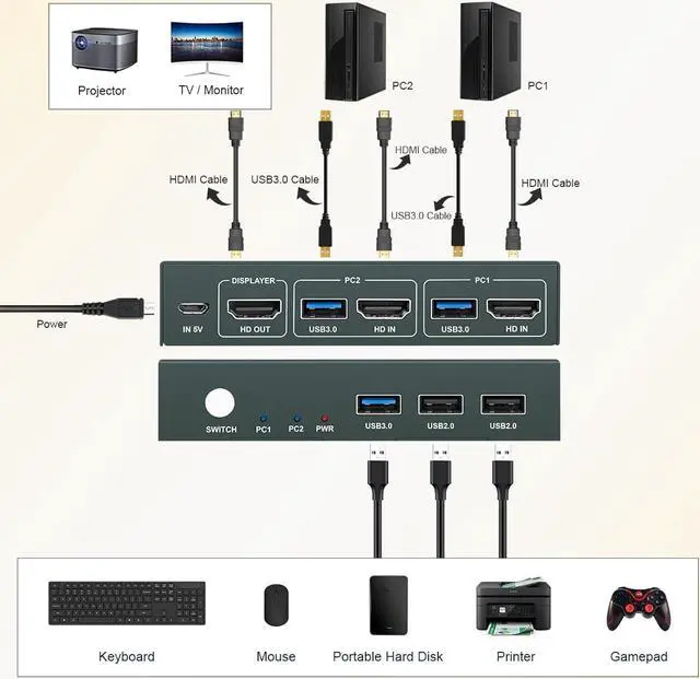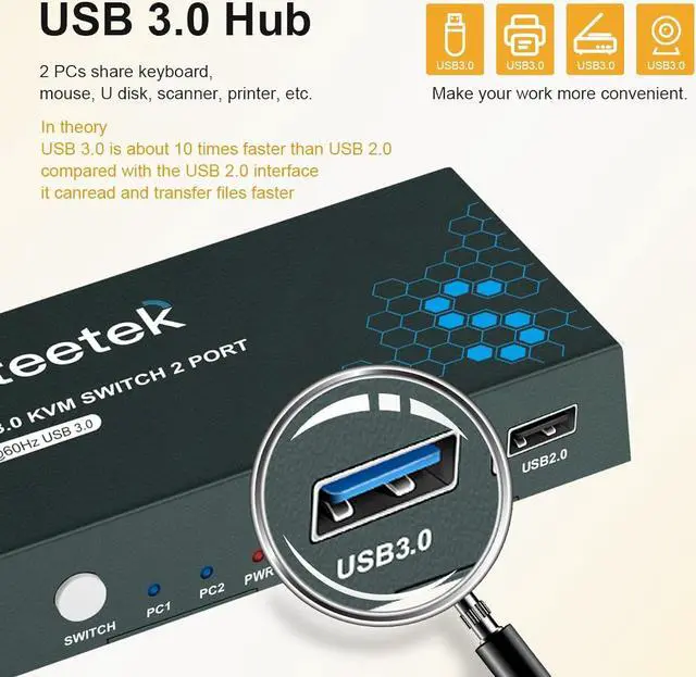 Zell Kvm Switch Usb 3.0, 2 In 1 Out 4K@60Hz Kvm Switch, For 2 Computers Share 1 Monitor 1 Set Keyboard Mouse Usb 3.0 Kvm Switch, Button Switching, With 2 Usb And 2 Cables