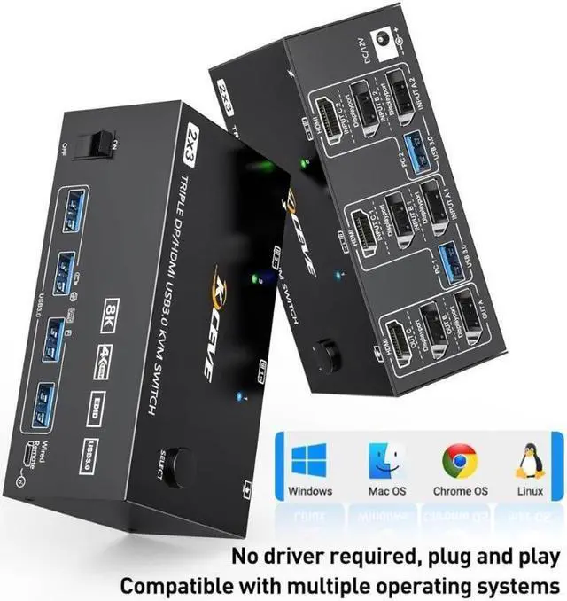 2 Displayport 1.4 + HD-MI 2.1 USB 3.0 KVM Switch allows 2 desktop computers/laptops to share 3 monitors and 4 USB 3.0 ports(keyboard, mouse and other USB devices). It can make your work space tidy and efficient, also a premium choice for working from home.