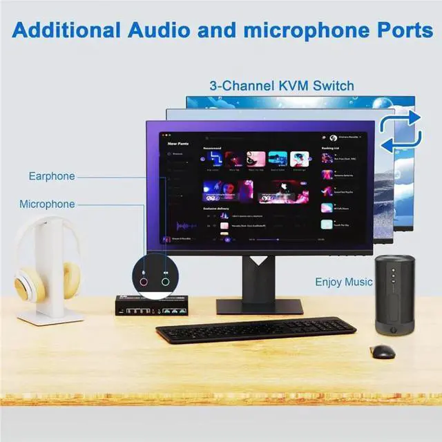 Display port kvm switch comes with a 3.5 mm Audio Jack port with a DAC chip inside, which can be inserted into a 3-segment 3.5 mm earpiece device, and a 3.5 mm microphone interface, which can be inserted into a 3-segment microphone.