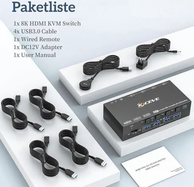 8K@60Hz KVM Switch HDMI 4 Port, 4 PC 1 Monitor HDMI KVM Switch 4 in 1 Out, EDID Simulation, For 4 Computers Share 1 Monitor and 4 USB 3.0 Port, with Wired Remote, Power Adapter & USB 3.0 Cable