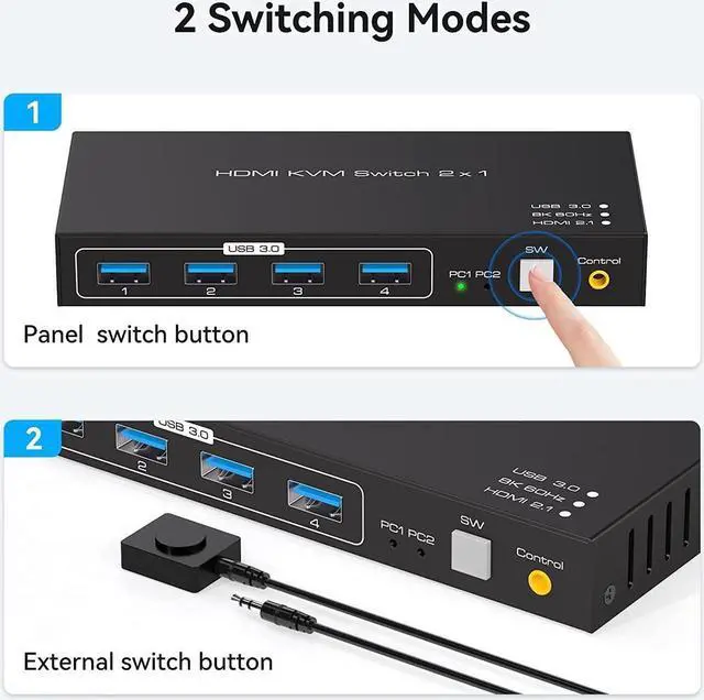 This kvm switcher 4k 120hz not only supports push-button switching and external line switching, but also has an LED light design, which shows active devices so you can clearly see which device is in use.
