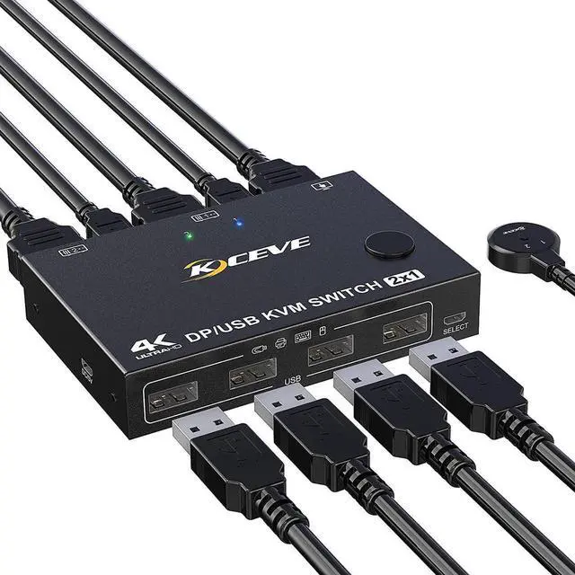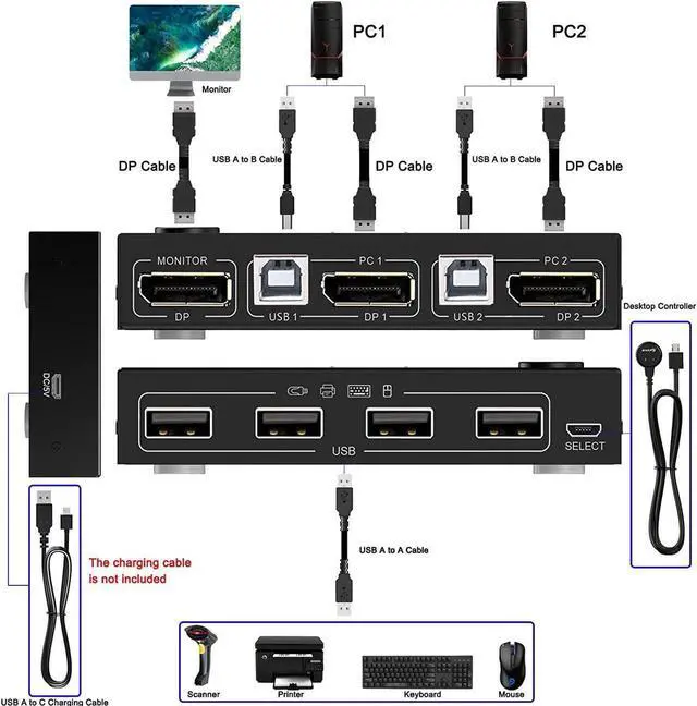 This DP KVM Switcher is a displayport switch that allow you to share one monitor and 4 USB 2.0 devices such as scanner, printer, mouse, keyboard between two computers