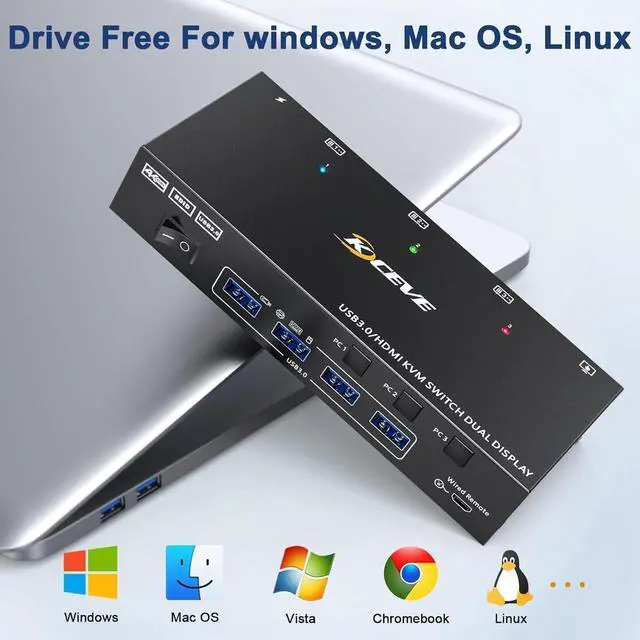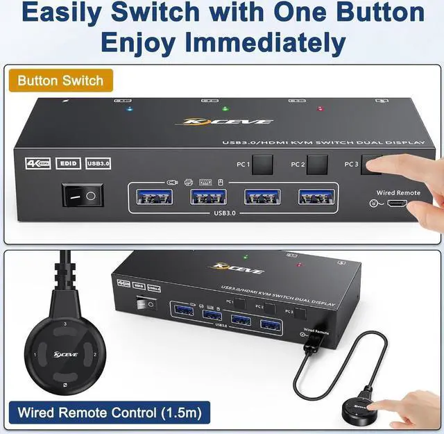 USB 3.0 Dual monitor HDMI KVM switch is specially designed for users who have 3 PCs and 2 monitors.
