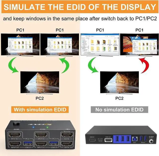 USB 3.0 KVM Switch with EDID emulators in each input port, keep computers always having correct display information when switch back.