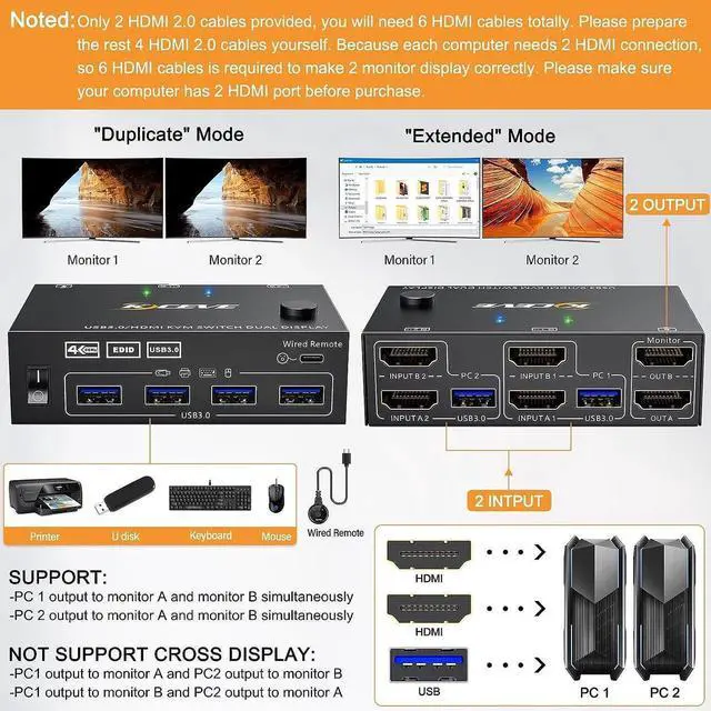 This USB 3.0 version dual monitor KVM switch is for 2 computers share 2 monitors, keyboard, mouse and USB devices. Please connect all cables to make 2 display work properly.