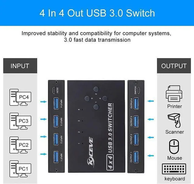 USB 3.0 standard switch allow high speed and stable data transfer. It's a great choice for 4 computers share 4 usb devices.