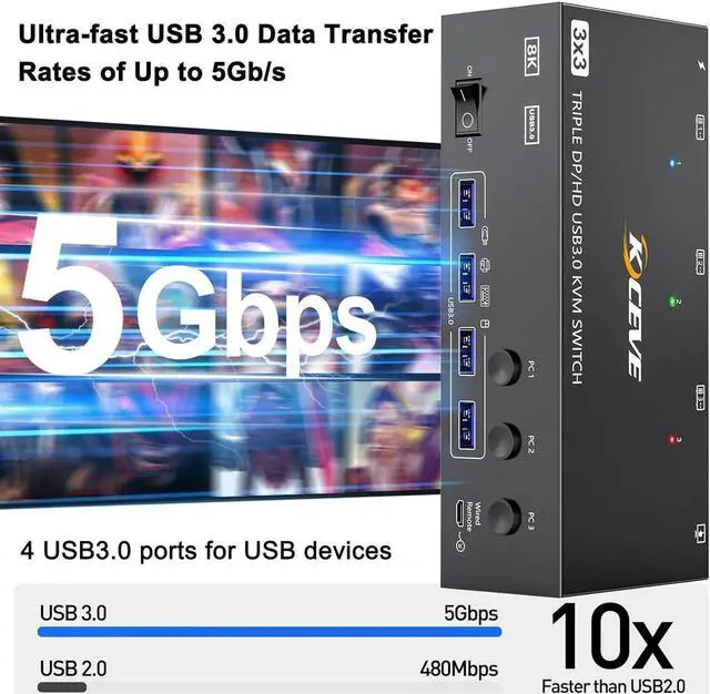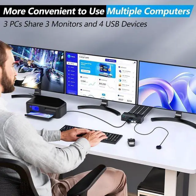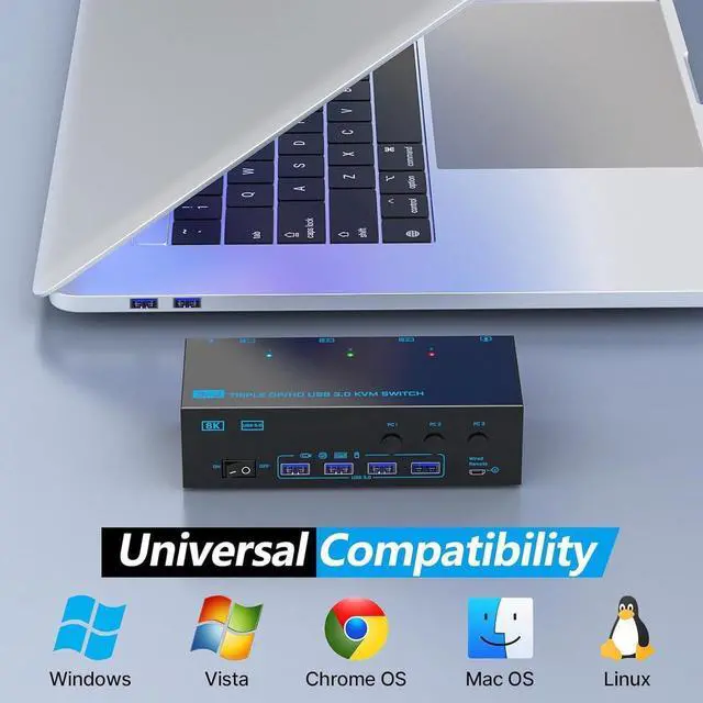The KVM switch 3 monitors driver-free for Windows, Mac, Linux, Unix, Ubuntu. Support input devices such as PC, Laptop, PS4, Raspberry Pi, DVR, NVR. Applied for Office, Game, Meeting, etc..