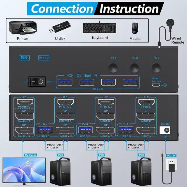 Each PC requires 1*HDMI+2*DP+1* USB cable to connect the 3 monitor KVM switch, OUT A, OUT B, OUT C connect to 3 monitors. Support DP to HDMI, USB-C to HDMI, USB-C to DP converter and USB-C docking station.