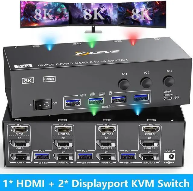 This 3 computers 3 monitors KVM switch perfect for hooking up 3 desktops /laptops to share one set of wired or wireless keyboard mouse and 3 monitors (supports extended and mirrored display modes).