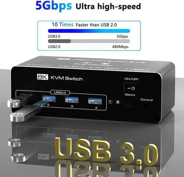 USB 3.0 KVM Switch: Comes with 4 USB 3.0 ports, offering data transfer rates up to 5Gbps (10 times faster than USB 2.0). Effortlessly share printers, cameras, and USB flash drives between 2 computers. Works seamlessly with Windows, Vista, XP, Mac OS, Linux, and Unix systems.