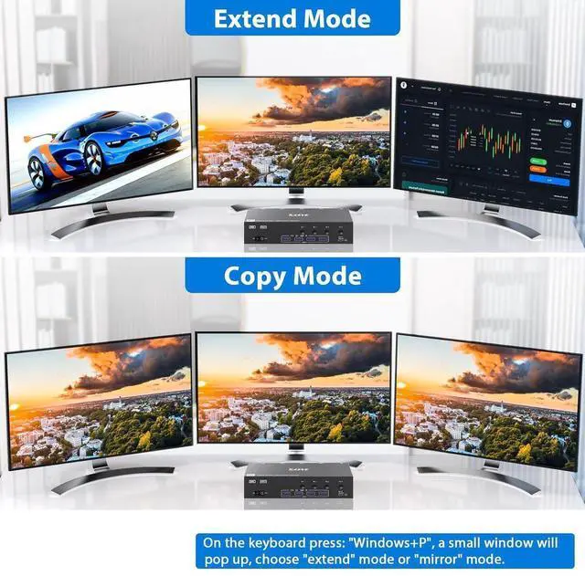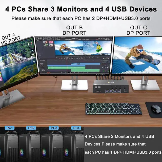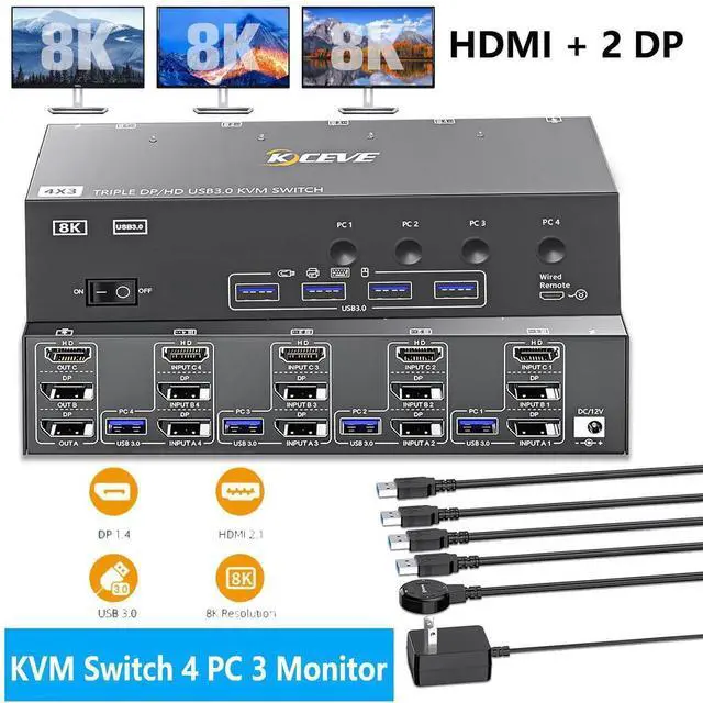 This 2 Displayport+HDMI triple monitor KVM switch is perfect for 3 computers or laptops to share 3 monitors and 4 USB 3.0 devices.