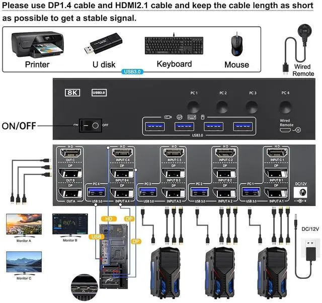 Note: Please connect the 12V DC power adapter to provide sufficient power. Using a shorter 8K HDMI + DP cable can make the KVM switch more stable.