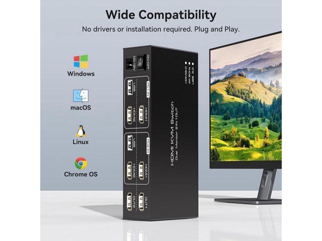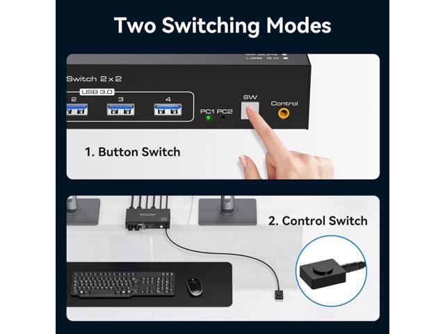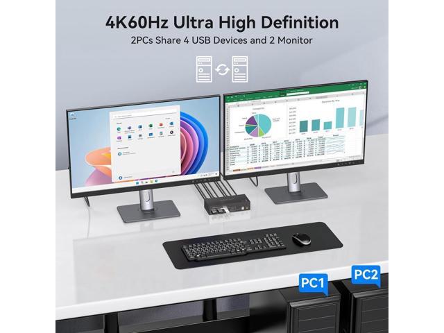 - [HDMI KVM Switch 2 Monitors 2 PC] KVM switch dual monitor allows 2 computers to share 2 monitors and 4 USB devices such as mouse, keyboard, etc. By distributing the HDMI1 and HDMI2 input ports on the upper and lower levels.