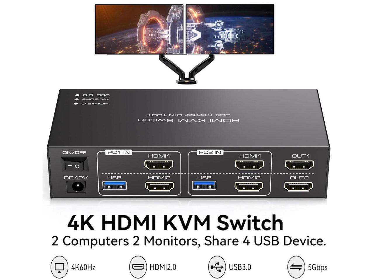 HDMI KVM Switch 2 Monitors 2 Computers 4K@60Hz Dual Monitor HDMI USB 3.0 KVM Switch for 2 Computers share 4 USB USB 3.0 Devices Support Copy & Extend Mode with 12V DC Power Supply & Cable