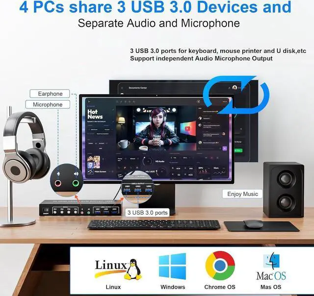 With this 4 port USB 3.0 dual-monitor HDMI KVM Switch (HDMI+HDMI), you can easily control 4 signal sources at the same time, share the same keyboard and mouse, and share 2 monitors.