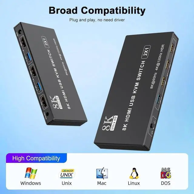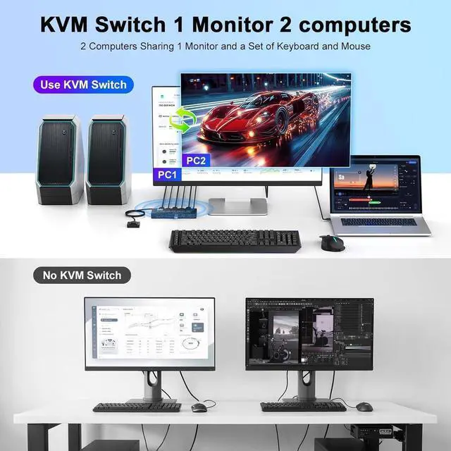[KVM Switch 1 Monitor 2 Computers] This HDMI KVM Switch allows control of 2 Computers while sharing 1 monitors and 4 USB devices along with a single keyboard and mouse,it's a complete USB switch and HDMI switch rolled into one.Compatible with Windows 7/8/10/11/Vista/XP, Linux, Mac, and more.