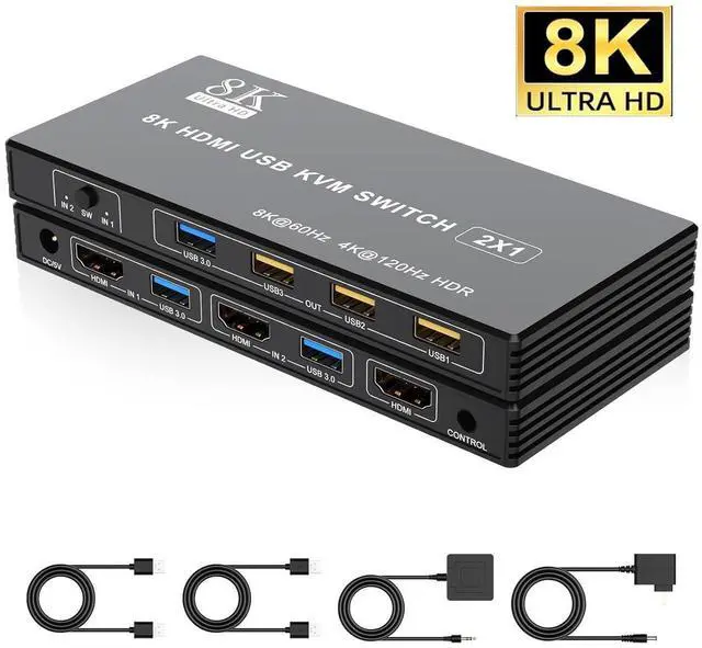 USB 3.0 HDMI KVM Switch 1 Monitor 2 Computers, Support 8K@60Hz 4K@120Hz, HDMI KVM Switches for 2 Computers Sharing Monitor Keyboard Mouse Printer, with EDID Adaptive, 2 USB Cable & Controller