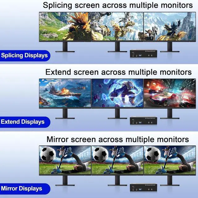 3 Monitors KVM Switch DisplayPort: support resolution up to 8K@60Hz/4K@144Hz, and backward compatible with lower resolution.