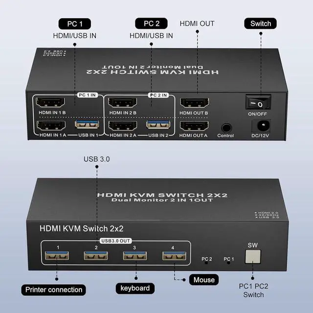 A4: The HDMI outputs on the KVM switch need to match the inputs. For instance, if you connect a PC to HDMI IN 1B, it will display through HDMI OUT B, while HDMI IN 1A will correspond with HDMI OUT A.