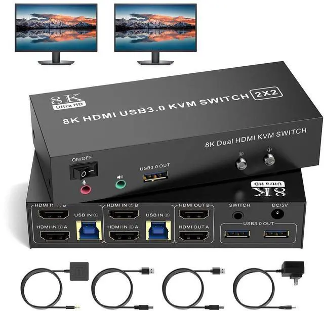 HDMI KVM Switch 2 Monitors 2 Computers Support 8K@60Hz 4K@60Hz, Dual Monitor KVM Switcher PC Extended Display for 2 Ports PC Share 4 USB 3.0 Keyboard Mouse Printer with Desktop Controller