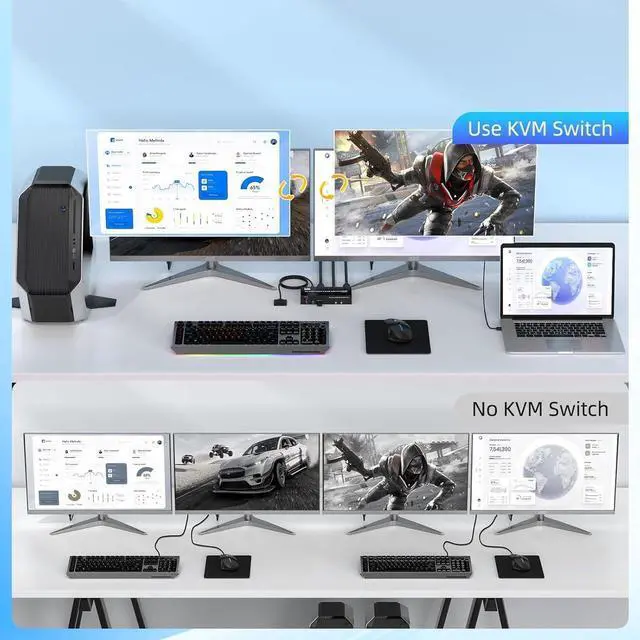 [HDMI 2.1 KVM Switch Dual Monitors] This KVM switch allows seamless control of 2 computers while sharing 2 monitors and 4 USB devices along with a single keyboard and mouse. It supports flexible switching between extended mode and mirror mode.