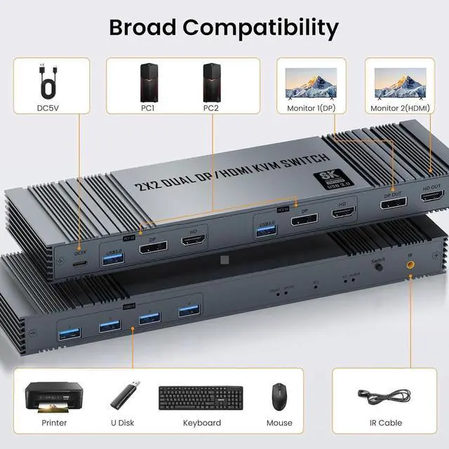With this HDMI displayport KVM switch, without constantly plug cables, make your desktop more tidy. It's perfect if you need to switch between 2 PCs, which can improve your work efficiency. Please use the included 2 USB cables to connect to the PC for the monitor switch to work properly. The KVM switcher input devices Supports laptops, PCs, X-box series, PS-5/PS-4, etc. Output devices of 2 computers 2 monitors KVM switch support Monitor, TV, Projector, etc.