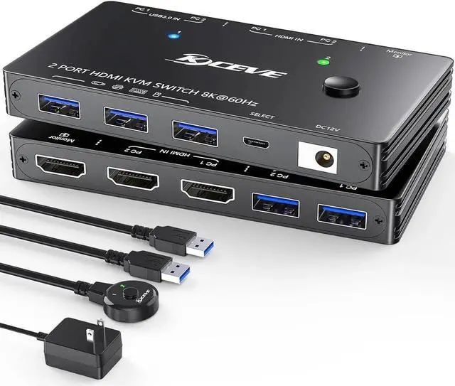 USB 3.0 8K HDMI KVM Switch --8K HDMI 2.1 KVM Switch 2 in 1 out with 3 USB 3.0 ports DC12V power allows 2 computers/2 laptops to share 1 monitor and a set of keyboard and mouse (Compatible with most of wired or wireless keyboard and mouse) and others USB 3.0 devices, such as printer and U-disk, scanners, etc.
