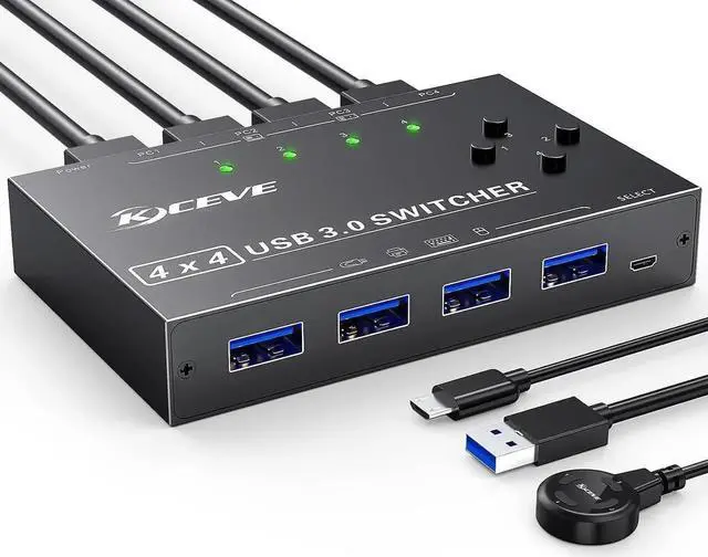 4 in 4 Out USB 3.0 Switch SelectorCamgeet 4 Port USB 3.0 Switcher allow using button switch or wired remote to toggle between 4 computers to share 4 USB peripheral devices without constantly pull cables or set up complicated network sharing software.