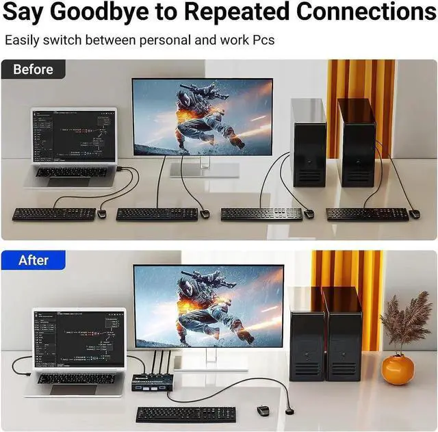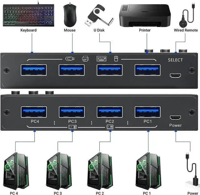 Multiple Device SharingThis USB 3.0 KVM switch allows you to share multiple devices such as mouse, keyboard, printer, scanner, U disk and other USB devices between 4 computers.