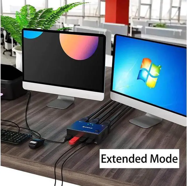 [2 Poer HDMI KVM Switch Dual Monitor] This KVM switcher allow you to control 2 PCs by only one set of keyboard & mouse, share 4 USB devices and 2 monitors (Extend display mode or copy display mode). Please note that the extended mode can output 2 different screens, and the copy mode can output 2 identical screens.