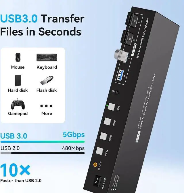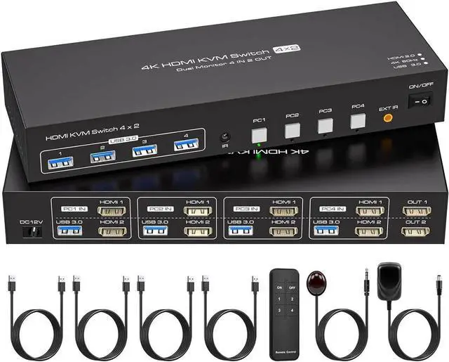 kvm switch 4 computers 2 monitorsThe hdmi kvm switch 4 port allows you to share 2 monitors and 4 USB 3.0 devices between 4 computers or laptops. You can control all 4 computers and 2 monitors directly with a single set of keyboard and mouse, greatly simplifying your office setup and increasing efficiency.